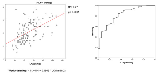 Linear regression analysis between LAVi and PAWP and ROC curve (AUC = 0.82).