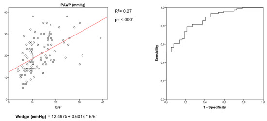 Linear regression analysis between E/e’ and PAWP and ROC curve (AUC = 0.86).