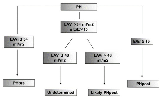 In conclusion, our study confirms that the echocardiographic parameters more strictly associated with LV filling pressures in PH patients are E/e’ and LAVi. Moreover, we tested a new diagnostic algorithm based only on an echocardiographic assessment, aimed at identifying patients with postcapillary PH. The use of this diagnostic algorithm based on the E/e’ and atrial volume can be used as an adjunct to improve the diagnostic accuracy of echocardiography in the nosological definition of pulmonary hypertension.