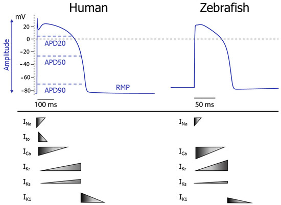 Comparison between human and zebrafish ventricular action potential. At the top, the ventricular action potential shape is depicted in both human and zebrafish. The bottom shows the relative magnitude of the main ion currents that contribute to the different phases of the action potential. APD20, −50 and −90 = action potential duration at 20, 50 or 90% repolarisation, RMP = resting membrane potential, INa = sodium current, Ito = transient outward potassium current, ICa = calcium current, IKr = rapidly delayed rectifier potassium current, IKs = slow delayed rectifier potassium current, IK1 = inward rectifier potassium current. Figure adapted from Van Opbergen et al. [35].