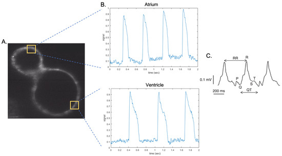 Optical mapping and ECG of the zebrafish heart. (A). Section of the heart of a 3 dpf zebrafish embryo expressing the Ace2n-mNeonGreen voltage sensor. The yellow squares indicate the areas in which fluorescence intensity is analysed to obtain the sample traces in (B). (B). Action potentials from a 3 dpf zebrafish embryo obtained with light sheet microscope. Top: atrial sample trace. Bottom: ventricular sample trace. (C). A raw ECG recording of a 2 dpf zebrafish embryo; P, Q, R, S, T waves, and RR and QT intervals indicated. (Figure modified from Thorsen et al. [69] ).