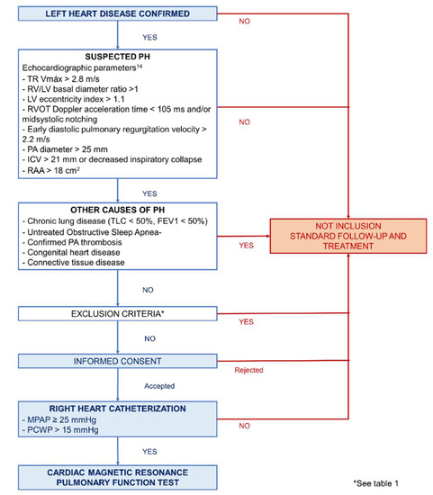Hemodynamic evaluation will be performed after treatment optimization with diuretics, inotropes, and/or pulmonary vasodilators, following clinical parameters, and always before MRI (Figure 1). In patients considered for heart transplantation or LVAD who have combined PH, pulmonary vasodilator testing will be performed in order to assess the reversibility of the precapillary component (reduction of PVR ≤ 3). In the case of non-response to vasodilators, the precapillary component of PH is fixed and irreversible, and a formal contraindication for heart transplantation.