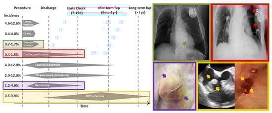 Therapy based on CIED implantation constitutes a very peculiar model in medicine, differing from other treatments in several aspects. Costs for pharmacological therapy are spread over the time of patient follow-up, whereas for CIED and surgical/interventional therapy the costs are apparent upfront. However, pharmacological treatments do not have a predefined termination date, whereas CIEDs inevitably experience battery depletion. Moreover, surgical or interventional treatments do not require device tailoring, and when the intervention requires the implantation of a device, this cannot (realistically) be upgraded but at most repaired (e.g., the coronary angioplasty of a previous coronary bypass or transcatheter prosthetic valve implantation). In addition, unlike all other treatments, CIED replacement, which carries a low risk of serious complications, is mandatory to ensure continued therapy delivery when the battery is drained. These factors demonstrate the increased complexity associated with long-term CIED therapy, as well as the risk of developing CIED-related complications. Several registries were designed to explore the incidence and predisposing factors associated with these complications [5]. Notably, there is a huge variability in terms of incidence of major complications, ranging from 0.5% to 36.5% [5] depending on the type of implanted CIED (PM vs. ICD vs. CRT), type of procedures (first implant, upgrade, or device replacement), temporal window, and classification of the various events. Two recent papers highlight the importance of these factors. Ezzat et al. provided a systematic review [6] of ICD complications, comparing figures provided by randomized control trials and registries. The pooled complication rate from the trials was 9.1% (including lead displacement (3.1%), infections (1.5%), pneumothorax (1.1%), and hematoma (1.2%)). On the contrary, data from the largest ICD registry™ (United States National Cardiovascular Data Registry (NCDR®)) reported a statistically significant three-fold lower total major complication rate of 3.08% (including lead displacement (1.02%), hematoma (0.86%), and pneumothorax (0.44%)). These findings call for the standardization of the international classification of CIED-related complications as well as methods to reduce/eliminate underreporting. The second paper from Palmisano et al. [7] reported the results of a prospective, multicenter (six high-volume centers), Italian registry specifically designed to collect data on complications within three years after de novo CIED implantation. A complication was defined as any CIED-related adverse event requiring surgical revision. They compared patients with complications to those without, and used unadjusted rates. The authors observed 283 complications in 2811 enrolled patients. In particular, early complications (occurring within 30 days after implantation) were associated with an increase in cardiovascular and all-cause mortality (1.7-fold and 2.8-fold increase, respectively). The association between complications and all-cause mortality was already known; however, the authors highlighted that the impact of early complications on cardiovascular and all-cause mortality could extend up to 96 months. Moreover, they underlined the relevance of CIED infection as the most important complication in relation to cardiovascular mortality, mainly associated with heart failure and sudden death due to non-reimplantation after CIED extraction. However, another more plausible explanation is the development of multi-organ-failure secondary to unsolved systemic infections in these patients, especially considering the absence of a correlation between re-implantation and post-extraction survival [8]. It is interesting to note that CIED infections can occur both early on and several years after CIED procedures, probably due to different factors, especially in patients with more complex devices (Figure 1) [9,10].