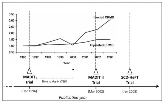 Relationship between the publication date of three leading randomized trials on implantable defibrillators for the primary prevention of sudden cardiac death and the disproportionate increase in the number of CIED infections with respect to implantation rate. Modified from “Infections of Cardiac Implantable Devices” by Diemberger, I.; Boriani, G., 2020, Infections of Cardiac Implantable Devices, VI, 229, Copyright [2020] by the Springer International Publishing. CMRD: cardiac rhythm management devices.
