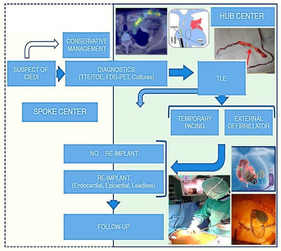 Proposed hub-spoke approach for the management of CIED infection. Modified from ref 27 (From “The Struggle against Infections of Cardiac Implantable Electrical Devices: The Burden of Costs Requires New Personalized Solutions.” by Boriani, G.; Elsner, C.; Diemberger I. 2018, Europace, 20, 1877–1879, Copyright [2018] by the Oxford University Press).