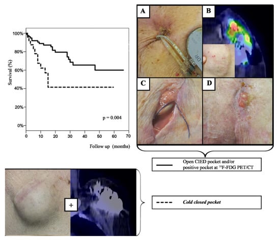 Survival curves (Kaplan–Meier) considering all-cause mortality according to the presence/absence of a “cold closed pocket”, defined as the absence of pocket skin lesion or metabolic activity revealed by 18F-FDG PET/CT scan. Legend: A, C, D = cases of CIED infection with overt pocket involvement. B = CIED infection with hidden pocket involvement, as revealed by 18F-FDG PET/CT. Reproduced from “Contribution of PET imaging to mortality risk stratification in candidates to lead extraction for pacemaker or defibrillator infection: a prospective single center study” Diemberger, I. et al., 2019, European Journal of Nuclear Medicine and Molecular Imaging, 46, 194–205, Copyright [2019] by the Springer Nature.