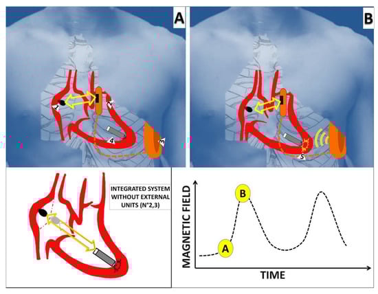 Heart activity monitoring with leadless devices. (1) A magnet placed in the right atrium, through which movements are revealed during the cardiac cycle using an external subcutaneous Hall effect sensor (HES) (2). The distance between magnet and HES decreases with atrial diastole (A), with a consequent increase in the magnetic field that reaches a maximum when the distance is minimal ((B), atrial systole). Once atrial activity is revealed, the external device (4) can drive a ventricular leadless pacemaker (PM) (3). To avoid the necessity for external subcutaneous devices, an HES could be probably inserted directly in the leadless PM (5). Modified from “Infections of Cardiac Implantable Devices” by Diemberger, I.; Boriani, G., 2020, Infections of Cardiac Implantable Devices, VI, 229, Copyright [2020] by the Springer International Publishing.