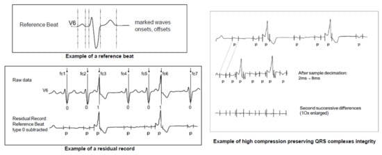 Example of the high compression obtained by subtracting a reference beat from all complexes (including extrasystoles), filtering and sample decimation of the non-protected areas, and second difference calculations [42]. These types of lossy compression schemes, e.g., filtering, sample decimation, and beat subtraction, are no longer allowed in SCP-ECG V3.0 (See Chapter 4 and [39]). Figure adapted from EN 1064:2020 [39].