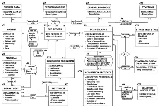- Fayn, J.; Rubel, P.; Willems, J.L.; Conti, L.; Reniers, R. Design and implementation strategies of a core database model for the storage and retrieval of serial ECG data. In Proceedings of the Computers in Cardiology, Bethesda, MD, USA, 25–28 September 1994; Murray, A., Arzbaecher, R., Eds.; IEEE Computer Society Press: Los Alamitos, CA, USA, 1994; pp. 109–112. [Google Scholar] [CrossRef]