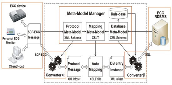 Generic bi-directional SCP-ECG message to database interface schema. This is an updated version of the original “File to Database” schema developed by the OEDIPE project [49], where eXtensible Markup Language (XML) and eXtensible Stylesheet Language Transformations (XSLT) tools were based on Abstract Syntax Notation 1 (ASN.1) [50,51]. The interface updates the database with electrocardiographic information coming from the messages and gives the message handler data retrieved from the database. The solution contains generic software modules independent of the database and SCP-ECG protocol layout. It accesses a descriptive data dictionary containing the database structure, the data format layout, and the mapping between both. The design involves issues related to structure description and standard query language generation and allows automating the development of SCP-ECG Vx.i to Vy.j converters. For more details, see [50,62,63].