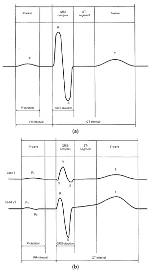 - Kligfield, P.; Gettes, L.S.; Bailey, J.J.; Childers, R.; Deal, B.J.; Hancock, E.W.; van Herpen, G.; Kors, J.A.; Macfarlane, P.; Mirvis, D.M.; et al. Recommendations for the Standardization and Interpretation of the Electrocardiogram. Part I: The Electrocardiogram and Its Technology. A Scientific Statement From the American Heart Association Electrocardiography and Arrhythmias Committee, Council on Clinical Cardiology; the American College of Cardiology Foundation; and the Heart Rhythm Society. Endorsed by the International Society for Computerized Electrocardiology. Circulation 2007, 115, 1325–1332. [Google Scholar]