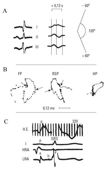 - Julià, J.; Bayés de Luna, A.; Candell, J.; Fiol, M.; Pons, G.; Obrador, D.; Oca, F.; Trilla, E.; Vilaplana, J.; Wilke, M. Aberrancia auricular: A propósito de 21 casos. Rev. Esp. Cardiol. 1978, 31, 207. [Google Scholar] [PubMed]