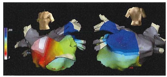 - Garcia Cosio, F.; Martín-Peñato, A.; Pastor, A.; Núñez, A.; Montero, M.A.; Cantale, C.P.; Schames, S. Atrial activation mapping in sinus rhythm in the clinical electrophysiology laboratory. Observations in Bachmann’s bundle block. J. Cardiovasc. Electrophysiol. 2004, 15, 524–531. [Google Scholar] [CrossRef]