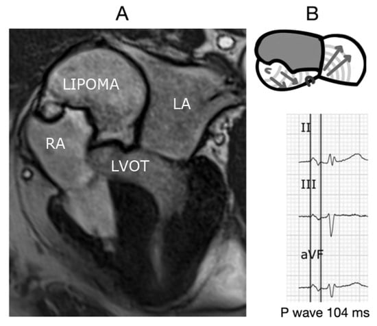 (A,B) A case of a 73-year old man found to have a large lipoma (4 × 5 cm) located on the interatrial septum. Cardiac magnetic resonance imaging allowed for complete characterization. As the atrial fibrosis is not extended in all atria, the duration of the P-wave in spite of A-IAB is <120 ms. (Taken from reference 38).