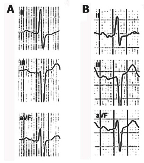(A) P-wave in a case of A-IAB atypical type 3 by morphology. Note that the P-wave is negative in III and aVF, but with a first part isodiphasic as may be seen with vertical lines. It may be confused with junctional rhythm, but in this case (see B) all the P-wave is negative and, furthermore, the P-wave is also negative in V4–V6. (Taken from reference 37).