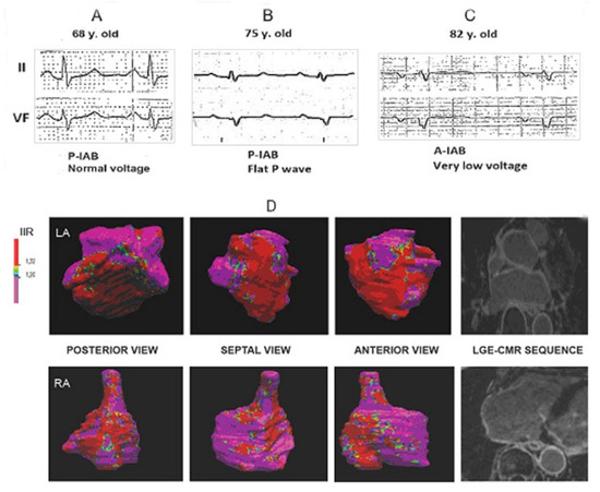 A case that describes the temporal evolution (A–C) of IAB. (A) P-wave of partial IAB to a definitive A-IAB pattern (C) with extremely low voltages. See in the lower part (D), magnetic resonance image with advanced fibrosis.