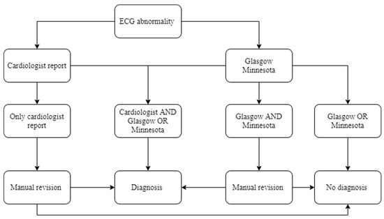 Diagram for ECG abnormality diagnosis. Concordance between the cardiologist’s report and one of the automatic systems (Glasgow or Minnesota) was required for a diagnosis to be accepted without manual revision.