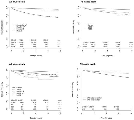 The primary end point was all-cause mortality. All International Classification of Diseases (ICD) codes were considered for all-cause mortality. The secondary end point was cardiovascular mortality, defined by nine groups of cardiovascular disease through ICD coding: rheumatic heart disease (I01–I01.9, I02.0, I05–I09.9), ischemic heart disease (I20–I25.9), cerebrovascular disease (G45–G46.8, I60–I61.9, I62.0, I63–I63.9, I65–I66.9, I67.0–I67.3, I67.5–I67.6, I68.1–I68.2, I69.0–I69.3), hypertensive heart disease (I11), myocarditis (A39.52, B33.2–B33.24, D86.85, I40–I43.9, I51.4–I51.5), atrial fibrillation or flutter (I48), aortic aneurysm (I71), peripheral artery disease (I70.2–I70.7, I73–I73.9) and endocarditis (A39.51, I33–I33.9, I38–I39.9). The secondary outcome was evaluated only for AF, LBBB and RBBB diagnoses.