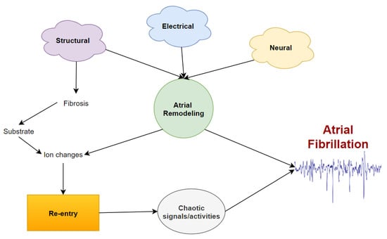 A brief mechanism [28] of AF can be illustrated in Figure 1. It is clear from Figure 1 how the atrial remodeling contributes to the development of chaotic signals which, in turn, causes AF.