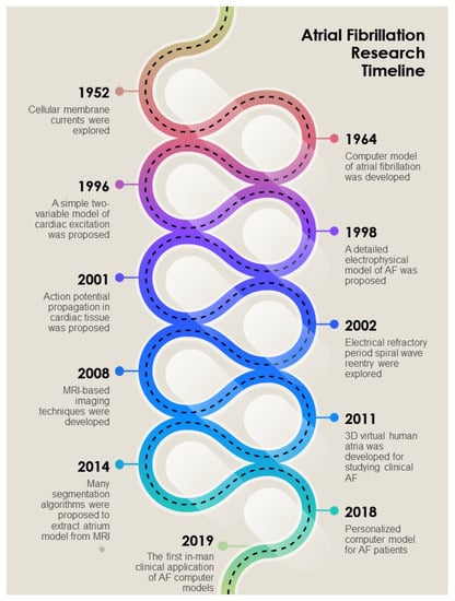 The primary objective of this brief literature review is to find the existing research gaps primarily in modeling, simulation, and diagnosis of AF [29,30,31]. There is still a need for optimized ablation procedures as stated in many articles in this field. As AF is a very important area for arrhythmia research, it demands to be well understood. The following Figure 2 shows the timeline of AF research during the past few decades.