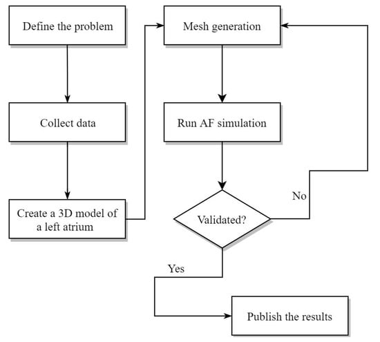 Atrial cells are modeled in most AF simulation examples. Since the generation of AF is contributed to the atrium (atrial cells) and its cellular remodeling, human atrial simulation models have been popular in the diagnosis of AF [12]. Simple 2D geometries [51,52] and quassi 3D geometric models [53] were used to model atrial cells. Human atrial action potential (AP) rate dependency in relation to K+ is explained with simulation in atrium [54]. A computational platform is presented in the literature that is described by a 3D human atria [55]. This computational model can be used to study the teratogenic patterns and behavior of the electro-physical nature existing in human atria. Being inspired by this study, an approach towards the electrical remodeling in atria is proposed [56]. A realistic 3D atrial tissue model is the key indicator that an AF-induced electrical remodeling is able to produce heterogeneous and shortened action potential durations (APDs). Thus, it might be possible to initiate and maintain the reentry of excitation waves throughout the whole atrium. A similar study [57] explains the risk of electrical remodeling in atrium. The authors use the CRN model [8] to present the simulation results. Insights from a 3D model of human atria have been discussed to explain the PerAF-induced electrical remodeling [58]. The basic steps of AF simulation study are presented in Figure 4. The usual simulation process begins by defining a problem followed by data collection using image, signals, etc. To run AF simulation, a fine 3D mesh (Figure 3) is necessary with some trigger points on its surface. These trigger points denote the entry of the chaotic signals to simulate AF.