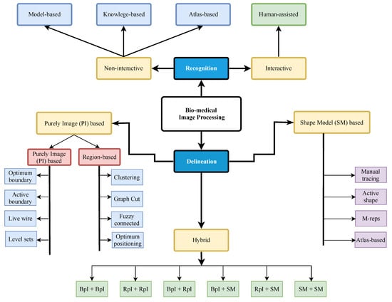 Image segmentation is a broad concept and has been investigated by researchers from different fields. It is defined as the process that partitions a picture or image into distinctive subsets. The most basic attributes used for image segmentation are—intensity, edges, textures, etc. First, the object’s whereabouts in the image are to be determined (called recognition). Then, the object’s spatial extent and composition in the scene are extracted (called delineation). Thus, recognition allows the information flow from humans to computer, and delineation allows the information flow from computer to humans. Both processes are integral to a successful image segmentation. In the next paragraphs, recognition and delineation are discussed in detail. There are many approaches to object recognition, but they fall into two broad categories—interactive and non-interactive. As shown in Figure 5, non-interactive approaches involve model, knowledge, and atlas-based recognition while interactive approaches mostly involve human-assisted recognition. Figure 5 also shows different approaches towards image delineation.