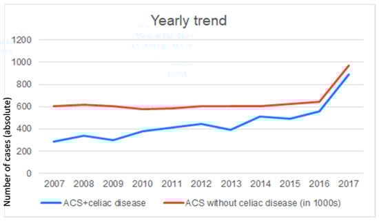 Among celiac disease patients, CV involvement represents a topic of growing interest. In this large nationally representative analysis of patients with ACS, only a small proportion of patients (0.07%) had underlying celiac disease. While still rare, there has been a steady rise in the prevalence of ACS in celiac disease patients, with a 3-fold increase demonstrated over the study period. This correlates with the increasing incidence of celiac disease in the 21st century, at a rate of approximately 8% every year [8].