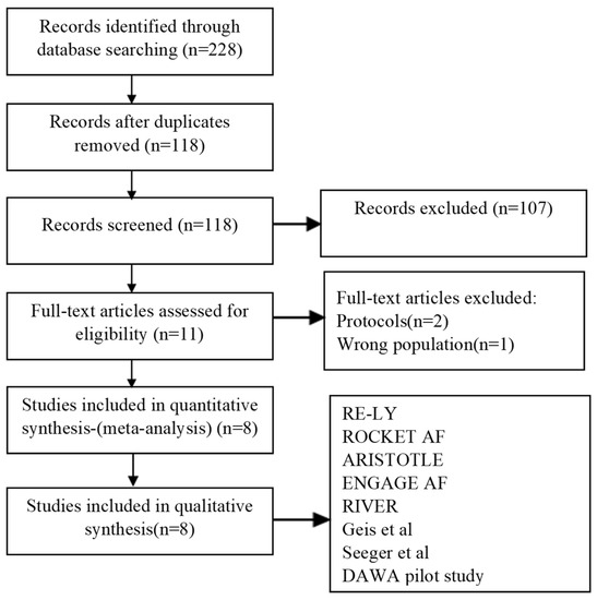 - Pan, K.; Singer, D.E.; Ovbiagele, B.; Wu, Y.; Ahmed, M.A.; Lee, M. Effects of Non–Vitamin K Antagonist Oral Anticoagulants Versus Warfarin in Patients With Atrial Fibrillation and Valvular Heart Disease: A Systematic Review and Meta—Analysis. J. Am. Heart Assoc. 2017, 6, e005835. [Google Scholar] [CrossRef]