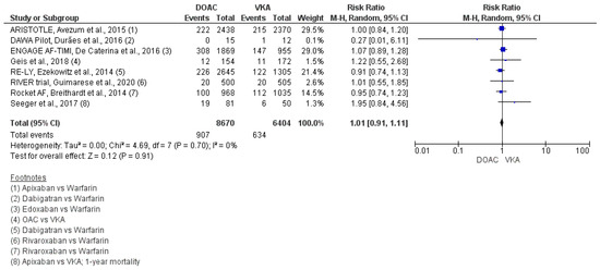 A total of eight studies including fifteen thousand and seventy-four participants were pooled for the meta-analysis of all-cause mortality. DOAC therapy was associated with an RR of 1.01 (95% CI: 0.92–1.11, p = 0.91) compared to VKA therapy with a 0% interstudy variability (I2 = 0%, p for I2 = 0.70, chi2 = 4.69, tau2 = 0) (Figure 3). For this outcome, we found no significant difference between the two groups.