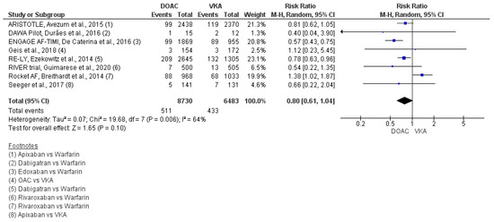 The beneficial effect of DOACs in preventing stroke and thromboembolic events was noted as a 24% risk reduction in our study Similarly, in recent meta-analyses, the risk reduction was noted to be about 35%, 22%, and 30% [28,29,30]. Likewise, the beneficial effect of DOACs in lowering the risk of intracranial bleeding was also consistent with these recent meta-analysis studies. The risk reduction in the other meta-analyses was 65%, 49%, and 53% [28,29,30], and it was 49% in our study. For this analysis, we included only six of the eight studies.