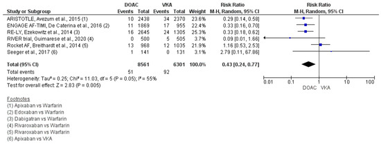 In individuals with VAF, prior randomized clinical trials comparing different DOAC agents or different doses of the same DOAC agent to VKAs found no significant difference in mortality [10,18,19,23,24]. The results of our study were consistent with the mortality outcomes in these studies. Major bleeding was another outcome, in which a significant difference was not found along with all-cause mortality between DOACs and VKAs in our study. The high heterogeneity identified with regards to major bleeding in our study was due to the ROCKET-AF study [24], where rivaroxaban was associated with a higher risk of major bleeding than warfarin.