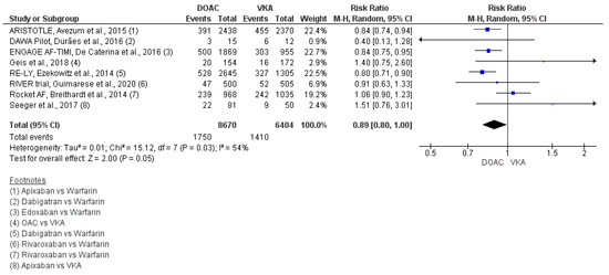 We pooled all the events from the eight studies for composite poor outcomes. A total of 15,074 participants were pooled for the total incidence of events; there were a total 1750 events noted in the DOAC arm compared to 1410 events in the VKA arm. The incidence was 20.1% (1750/8670) in the DOAC arm compared to 22% (1410/6404) in the VKA arm. The composite events included all-cause mortality, stroke–vascular events, major bleeding, and intracranial bleeding. The ENGAGE AF-TIMI trial reported the highest number of events, with the incidence of overall events measuring 26.7% and 31.7% in the DOAC and VKA arms, respectively. The pooled RR of composite events was 0.89 (95% CI: 0.80–1.00, p = 0.05) with no statistical variation in terms of heterogeneity (I2 = 54%, p for I2 = 0.03, chi2 = 15.12, tau2 = 0.01) (Figure 6).