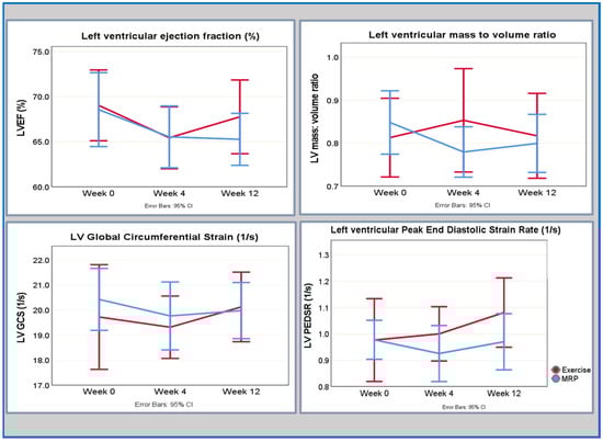 In the exercise group, the effect sizes for changes in the cardiovascular parameters were small, as outlined in Table 2. There was a trend towards a reduction in LVEF at 4 weeks, which returned to baseline by week 12; however, the effect size of those changes was small. Similarly, although there were small changes in the numerical values of circPEDSR and GCS, which trended towards an improvement at 4 weeks, the effect sizes were small for both indices across the two time points. There was a delayed response in the LV mass-to-volume ratio followed by a small trend towards an improvement seen at 12 weeks; however, both changes in the absolute values as well as the corresponding effect sizes were small.