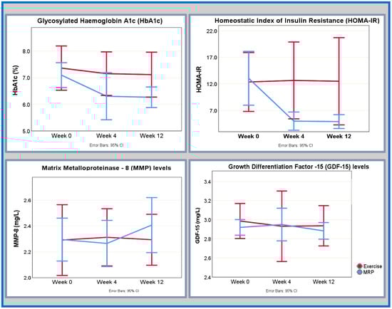 Changes in glycometabolic markers are given in Table 3 (MRP group) and Table 4 (exercise group) and presented graphically in Figure 2.