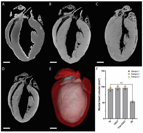 Effect of each sample preparation step on the volume of the murine heart. (A–D) microCT orthoslices of a murine heart imaged at four consecutive stages: at the introduction to the staining solution (T0) (A); after complete staining at room temperature (CECT) (B); after freezing in cooled isopentane and preservation in the cryo-stage (cryo-CECT) (C); and after paraffin embedding (PE) (D). (E) Overlaid 3D renderings of the completely stained murine heart imaged with CECT (red) and after paraffin embedding (gray). (F) Volume quantification of the murine hearts at each sample preparation step (n = 3). **: p-value < 0.01. Scale bars = 1 mm.