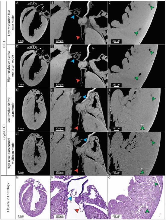Comparison of two imaging protocols (CECT and cryo-CECT), two imaging qualities (low-resolution fast scan mode and high-resolution normal multiscan mode) and classical 2D histology. (A–L) 2D orthoslices of the entire heart (left), the mitral and aortic valves (center) and the coronary blood vessels in the myocardium (right) from the CECT (A–C) and cryo-CECT (G–I) datasets acquired with low-resolution fast scan mode, respectively, and high-resolution normal multiscan mode (D–F) and (J–L), respectively. (M–O) Classical 2D histology sections of the same heart with hematoxylin and eosin staining. The blue and red arrows indicate the aortic and mitral valves, respectively. The green arrows indicate the large coronary blood vessels in the myocardium.