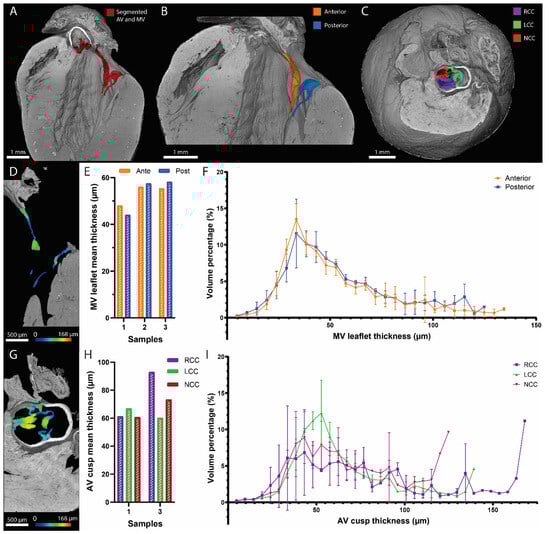 We demonstrated before that the high-resolution normal multiscan mode CECT datasets had the best imaging quality to visualize the heart valves. The mitral valve apparatus and the aortic valve cusps were segmented for illustration (Figure 4A). The anterior and posterior leaflets (Figure 4B) and the right, left and noncoronary cusps (Figure 4C) were identified for each heart valve, respectively. The thickness distribution of each leaflet (including the chordae tendineae) and cusp was computed in 3D, showing the added value of CECT compared to classical 2D histology (Figure 4D–I). The mean thickness of the mitral valve leaflets ranged from 44.10 µm to 58.21 µm, while for the aortic valve cusps, the mean thickness varied between 60.22 µm and 92.97 µm. The 3D distribution allowed the visualization of local variations in the leaflet and cusp thickness (Figure 4F,I and Video S5).