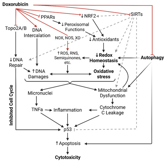 Illustrated summary of all doxorubicin’s mechanisms of cytotoxicity up to date. Red arrows indicate direct actions of doxorubicin. ROS = Reactive oxygen species; RNS = Reactive nitrogen species; NOX = NADPH oxidase; NOS = Nitric oxide synthase; XO = Xanthine oxidase; PPAR = Peroxisome proliferator-activated receptors; NRF2 = Nuclear factor erythroid 2-related factor 2; SIRTs = Sirtuin-like proteins; Topo2A/B = Topoisomerase 2A/B; TNFa = Tumor necrosis factor alpha. Created with Biorender.com (accessed on 26 December 2023).