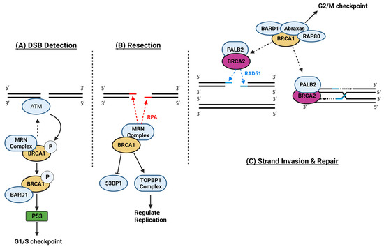 Roles of BRCA1 and BRCA2 in the three consecutive stages of Homologous Recombination Repair of Double-strand Breaks: (A) double-strand breaks detection; (B) resection of defect strands; (C) homologous strand invasion and repair. Abraxas = BRCA1-A Complex Subunit; MRN complex = Mre11, Rad50, and Nbs1 complex; BRCA1/2 = Breast cancer gene 1/2; BARD1 = BRCA1-associated RING domain protein 1; TOPBP1 = DNA topoisomerase 2-binding protein 1; RPA = Replication protein A; PALB2 = Partner and Locator of BRCA2; RAD51 = RAD51 Recombinase; RAP80 = Receptor-Associated Protein 80; p53 = Tumor Protein P53; 53BP1 = Tumor Protein P53 Binding Protein 1. Created with Biorender.com (accessed on 21 January 2024).