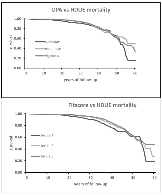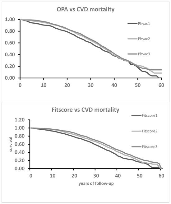 In Table 3, OPA and Fitscore used in combination in the same model had, for each end-point, four options to be significantly associated with mortality of the respective CVD groups. In the case of CHD, OPA was always not significant while Fitscore was inversely related to mortality when comparing class 3 with class 1. For HDUE and stroke, again, OPA was not significant while Fitscore was significant on all four occasions. Only in CVD, both OPA and Fitscore were always inversely related to mortality. This presentation mimics, multivariately, those given by the Kaplan–Meier survival curves of Figure 1, Figure 2, Figure 3 and Figure 4. Overall, in all four tests comparing high with low levels, Fitscore produced negative and significant coefficients corresponding to hazard ratios ranging from 0.58 to 0.79 while, for the same comparisons, OPA did so only two times with hazard ratios of 0.88 (only in CVD significantly so).