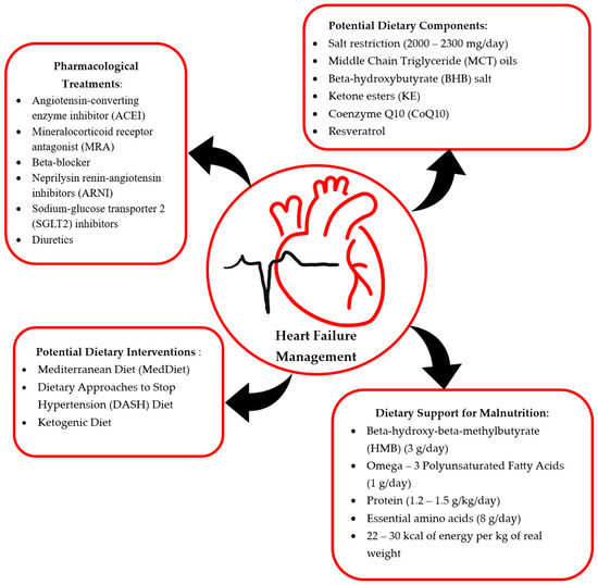 There is emerging evidence to suggest that diet and dietary interventions can have an impact on heart failure (HF) outcomes. Currently, the restriction of salt intake is the only dietary advice that is consistently guideline-recommended for the management of HF despite conflicting evidence for its efficacy. Dietary components that have been investigated in people with HF include middle-chain triglyceride (MCT) oil, beta-hydroxybutyrate (BHB) salts, ketone esters and coenzyme Q10 (CoQ10). Supplementation with these components is thought to be cardioprotective possibly due to an increase in myocardial energy production. There have been research studies on the effectiveness of The Dietary Approaches to Stop Hypertension (DASH) diet and the Mediterranean Diet (MedDiet) in the treatment of HF, but with conflicting results. The ketogenic diet (KD) has come to the forefront of interest due to evidence indicating its effectiveness in addressing the metabolic shift that occurs in HF. However, there is a lack of randomised controlled trials (RCT) centred around the KD. In any dietary intervention, factors such as adherence and compliance affect the validity of the results. Malnutrition, sarcopenia and/or cardiac cachexia can be present in the more advanced stages of heart failure. Nutritional screening, assessment and support/intervention are important aspects of treatment in the advanced stages of heart failure. Furthermore, HF management through dietary intervention is further complicated by the presence of comorbidities, such as diabetes mellitus (DM) and coronary artery disease (CAD). Long-term studies on the use of dietary modifications in people with HF are warranted to ascertain their efficacy, safety and side effects.