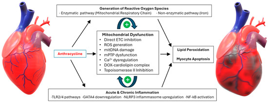 Anthracyclines (ANT), including doxorubicin (DOX), daunorubicin, epirubicin, and idarubicin, are chemotherapeutic drugs that have been widely effective in the treatment of various hematologic and solid malignancies since their introduction into clinical oncology in the 1960s. In the early stages of their therapeutic utilization, ANT-induced cardiotoxicity became a well-documented adverse effect that occurs in a single- and cumulative-dose-dependent manner [1].