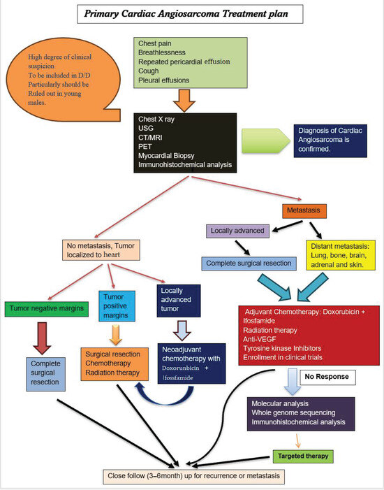 The treatment plan for angiosarcoma is based on the presence of tumor-free margins or tumor-positive margins. Additionally, patient management varies depending on the presence of a locally advanced tumor or, else, distance metastasis. A combination of surgical resection, chemotherapy, radiation, anti-molecule therapy, and targeted therapy based on immunohistochemical analysis are currently adapted treatment modalities based on the pertinent clinical scenario. Cardiac transplantation and enrollment in the clinical trials are made depending upon the clinical severity of patients. A summary of the treatment plan is presented in Figure 1.