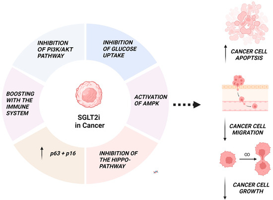 Several mechanisms have been proposed to explain the antitumor properties of SGLT2i, as detailed in the literature [96,97,98]. Notably, recent investigations have revealed significant upregulation of SGLT2 in numerous tumors and that it plays a pivotal role in promoting cancer cell survival [98].