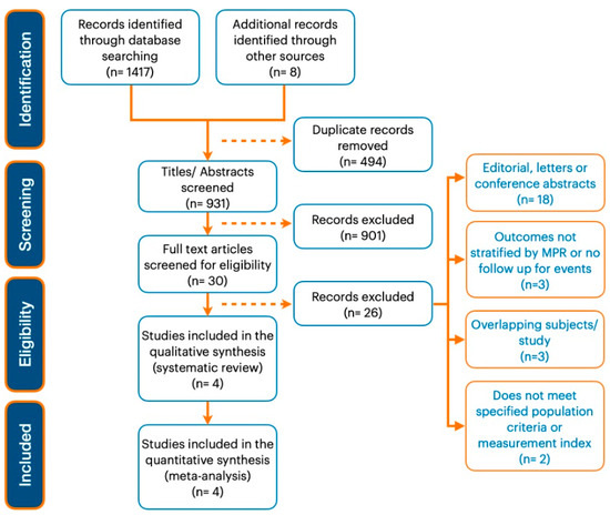 The systematic search identified 1417 potentially eligible studies. Eight additional records were identified during manual searches of reference lists. After removal of 494 duplicate records, 931 titles and abstracts were screened. Full texts from 30 studies were obtained and reviewed, of which 26 were excluded. Finally, a total of four studies, which investigated the impact of MPR/CFR on the prognosis of 384 individuals, met the inclusion criteria [5,6,7,8] (Figure 1).