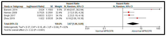 Forest plot of included studies, showing myocardial perfusion reserve (MPR)/coronary flow reserve (CFR) as an indicator of major adverse cardiovascular events of included studies. Hazard ratios for individual studies are represented by squares, and 95% confidence intervals (CIs) are represented by horizontal lines. The pooled estimate and the 95% confidence interval is represented by the diamond. The sizes of the squares are proportional to the weight assigned to each effect size, and the width of the diamond is proportional to the confidence interval of the pooled estimate. The arrow reflects that the CI is greater than 100 [5,6,7,8].
