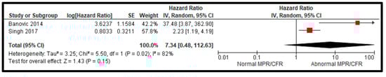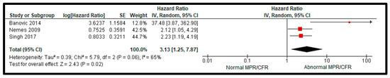 Sensitivity analysis including only those patients with asymptomatic moderate to severe aortic stenosis. Forest plot showing myocardial perfusion reserve (MPR)/coronary flow reserve (CFR) as an indicator of major adverse cardiovascular events. Hazard ratios for individual studies are represented by squares, and 95% confidence intervals (CIs) are represented by horizontal lines. The pooled estimate and the 95% confidence interval are represented by the diamond. The sizes of the squares are proportional to the weight assigned to each effect size, and the width of the diamond is proportional to the confidence interval of the pooled estimate [6,7].