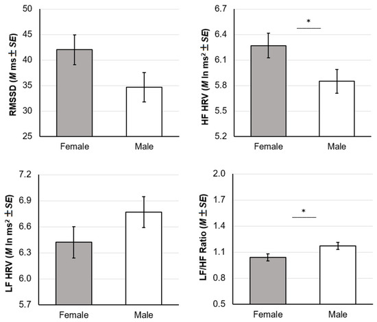 | LF HRV (M ln ms2, SD) | 6.26 (1.17) | 6.92 (1.22) | −2.70 | <0.01 |