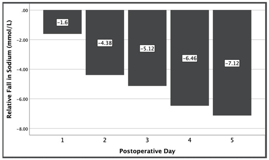 There was an overall decrease in serum sodium at day 5 among all patients relative to baseline serum sodium levels, ranging from a 5.6–9.7 mmol/L decrease (p < 0.001). Despite each group receiving statistically equivalent sodium loads, the vasopressin group had an increased fall in sodium from preoperative levels compared to the fall in sodium in the control group that was significant beyond the first postoperative day and increased over time (p < 0.001) (Figure 1).