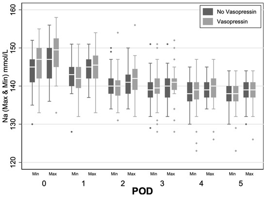 Descriptive statistics were created for the vasopressin and control groups where categories were represented in number (%) and continuous variables were reported in mean ± SD or median with 25th and 75th percentiles. Statistical significance was defined as a less than 5% chance of incorrectly rejecting the null hypothesis; p < 0.05. Bivariate comparisons of the vasopressin to the control group were conducted using chi-square (or Fisher’s exact) for categorical variables and Welch’s t-test (or Wilcoxon rank sum) for continuous variables. Comparisons across postoperative days within and between patients who received vasopressin were examined using mixed-effects linear regression with a patient random intercept and fixed effects for group (vasopressin versus control), days from surgery (modeled as a factor), and their interaction. We tracked the maximum and minimum serum sodium levels for each postoperative day for each patient. Daily sodium variability was measured via the subtraction of serum sodium minimum from serum sodium maximum within a single day for each patient. Daily mean sodium level was determined by averaging the daily serum sodium maximum and minimum values. We then analyzed the change in sodium average or sodium variability across days from surgery. This change was assessed by comparing the difference in values both between consecutive days and between each postoperative day and the baseline (postoperative day 0). All analyses were conducted in Stata version 18.0, Stata Corp LLC (College Station, TX, USA).